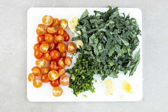 In einem mittelgroßen Topf ausreichend gesalzenes Wasser für die Pasta zum Kochen bringen. Den Schwarzkohl vom Strunk befreien und in feine Streifen schneiden. Die Tomaten halbieren. Den Knoblauch schälen und fein würfeln. Die Kräuter abzupfen und fein schneiden. Die Zitronenschale abreiben, dann eine Hälfte auspressen, die andere Hälfte in Spalten schneiden.