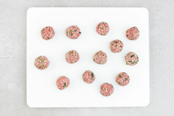 Das Hackfleisch mit der 1/2 des Knoblauchs oder mehr nach Geschmack, 1EL Kräutern sowie je 1 kräftigen Prise Salz und Pfeffer gut verkneten und mit angefeuchteten Händen zu walnussgroßen Fleischbällchen formen.