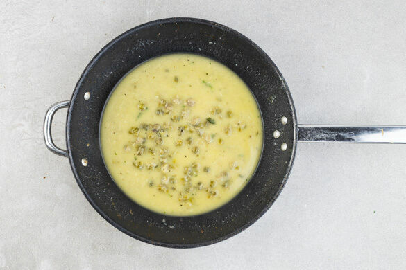 Die Kapern mit 1/2TL Mehl im Bratfett verrühren, dann mit dem Zitronensaft und 50ml Kochwasser ablöschen. 2EL Butter unterrühren und die Sauce mit dem Zitronenabrieb sowie Salz und Pfeffer abschmecken.
