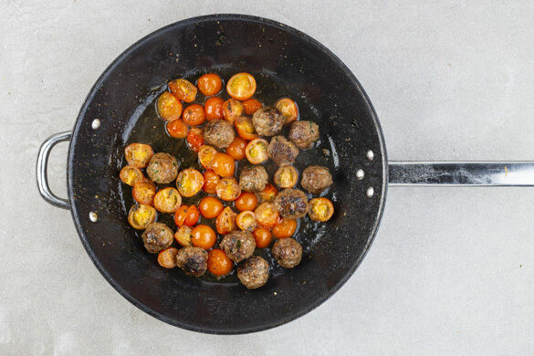 Die Hackbällchen in einer großen Pfanne mit 1–2EL Olivenöl bei mittlerer Hitze ca. 5min. rundum goldbraun anbraten. Die Tomaten dazugeben und weitere 3–4Min. braten. Die Hackbällchen und die Tomaten aus der Pfanne nehmen und bis zum Servieren warm halten.