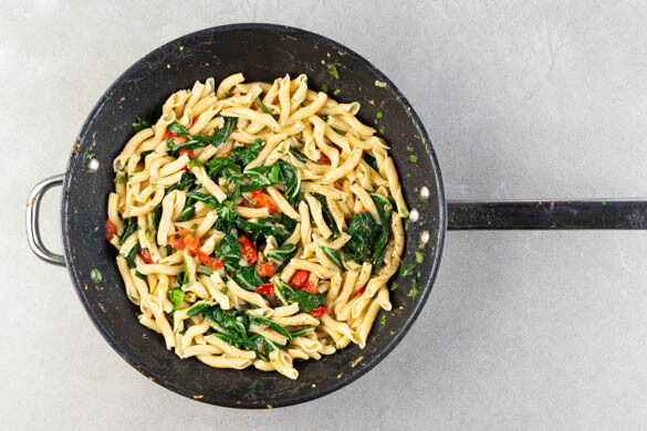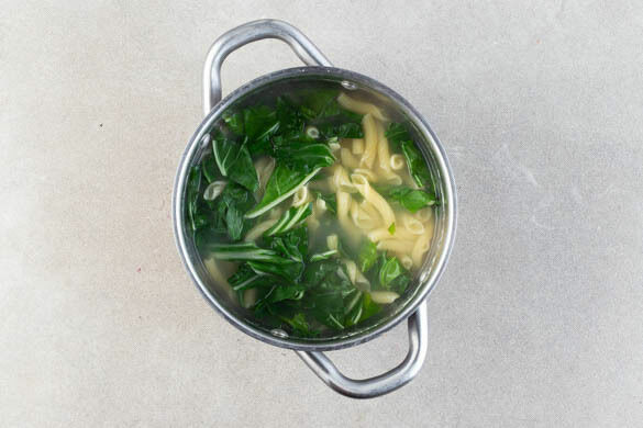 Die Pasta und den Schwarzkohl in das kochende Wasser geben und 6–8Min. garen, bis die Pasta bissfest ist. ca. 200ml Kochwasser abschöpfen, dann in ein Sieb abgießen.