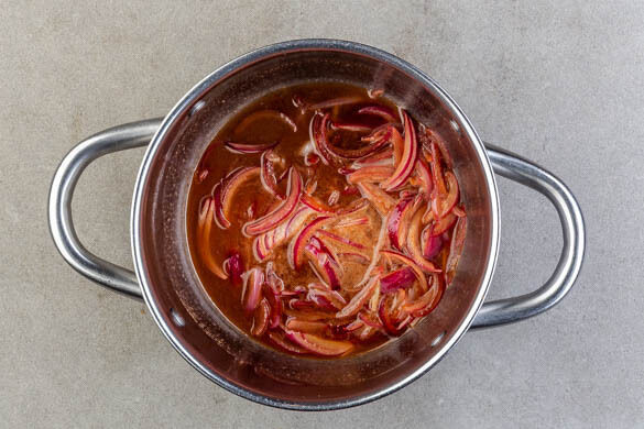 Preheat the oven to 220°C (200°C fan). Peel, halve, and slice the onions. In a medium-sized pot, cook the onion with 1Tbsp butter, 5Tbsp balsamic vinegar, 2Tbsp water, 3Tbsp sugar, and a large pinch of salt and pepper on low to medium heat until the onions are soft and jammy, 8–10min.