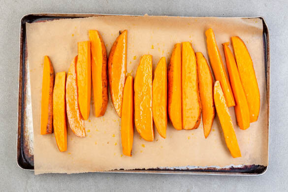Cut the sweet potatoes into wedges, then add them to a parchment-lined baking tray and toss the wedges with 2Tbsp olive oil and ½tsp of salt. Bake in the oven for 20–25min., turning the wedges halfway through baking.
