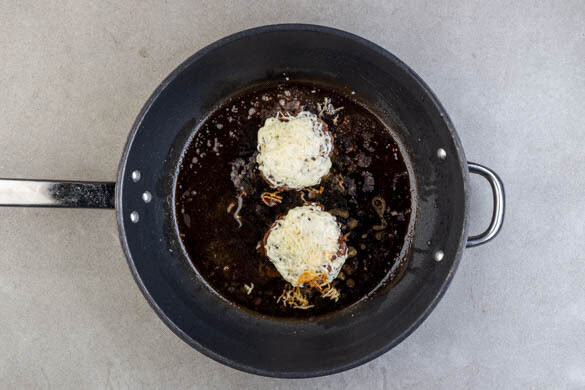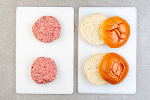 Heat a large pan on medium-high heat. Add 1Tbsp olive oil and the patties and fry for 3–4min. until browned on the first side. Then flip the patties, top with ½ of the cheese and cover with a lid to help the cheese melt. Fry for 3–4min. until the second side is browned and cooked to the desired doneness. Let rest covered on a plate.