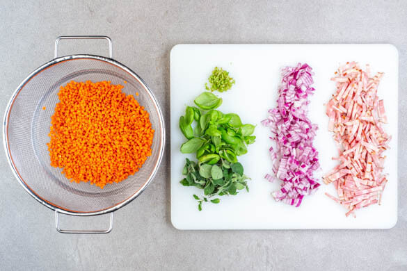 Die Baconscheiben übereinanderlegen und quer in ca. 0,5cm breite Streifen schneiden. Die Zwiebel schälen, halbieren und fein würfeln. Die Basilikum- und Oreganoblätter abzupfen. Die Oreganostängel wegwerfen, die Basilikumstängel fein schneiden. Die Linsen in einem Sieb mit kaltem Wasser abspülen und abtropfen lassen.