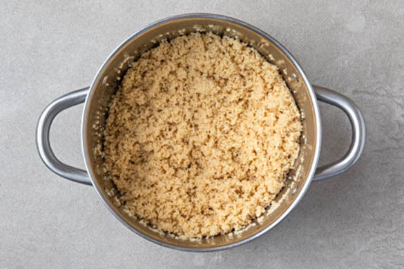 In einem mittelgroßen Topf 600ml leicht gesalzenes Wasser zum Kochen bringen. Den Topf vom Herd nehmen, den Couscous in das kochende Wasser rühren und abgedeckt 6–8Min. quellen lassen. Den Couscous mit einer Gabel auflockern.