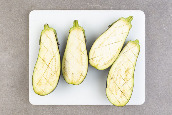 Den Backofen mit Grillfunktion oder Ober-/Unterhitze auf 230°C vorheizen. Die Auberginen längs halbieren und das Innere mit einem Messer kreuzartig einschneiden, dabei die äußere Haut nicht verletzen. Die Auberginen mit ca. 2TL Olivenöl einpinseln und mit der Schnittfläche nach unten auf ein mit Backpapier ausgelegtes Blech legen.