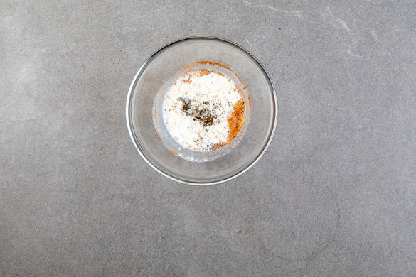 In einer kleinen Schüssel 100ml Milch und 1EL Senf mit einem Schneebesen verrühren, dann 3EL Mehl, die Gewürzmischung, ½TL Salz und 1 kräftige Prise Pfeffer unterrühren, bis eine dickflüssige Creme entsteht.