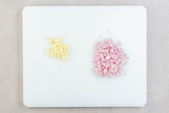 Den Backofen auf 220°C (200°C Umluft) vorheizen. Die Schalotte und den Knoblauch schälen und fein würfeln.