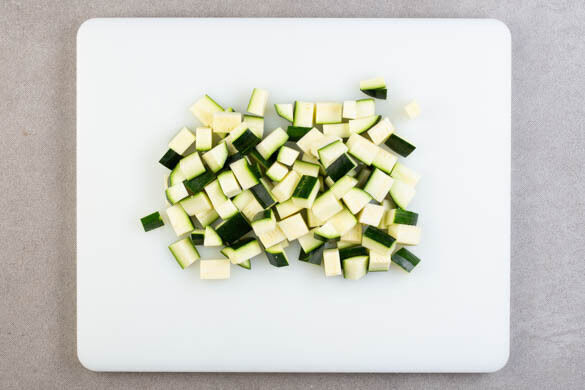 Die Zucchini längs vierteln und in ca. 1cm große Stücke schneiden.