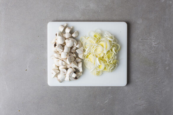 Die Champignons ggf. säubern und vierteln. Den Lauch in feine Ringe schneiden.