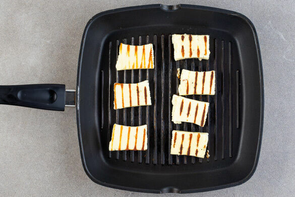 Den Halloumi in einer Grillpfanne bei mittlerer bis starker Hitze auf jeder Seite 2–4Min. anbraten, bis deutliche Grillspuren zu sehen sind. Tipp: Wer keine Grillpfanne hat, kann auch eine normale Pfanne verwenden.
