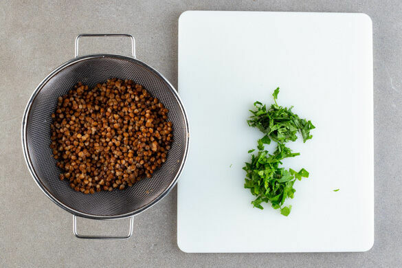 Inzwischen die Linsen in einem Sieb abtropfen lassen. Die Kräuter samt Stängeln fein schneiden.