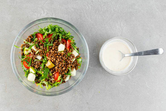 Wenn es mal wieder so richtig schön schnell gehen und gleichzeitig auch noch gesund sein soll: Wie wär’s mit einem proteinreichen Linsensalat mit Romana, knackiger Birne, fruchtiger Tomate und frischen Kräutern in einem aromatischen Dressing aus nussiger Sesampaste und spritziger Zitrone? Und dazu gibt es als zusätzliches Schmankerl knusprig angebratenen Halloumi. Drei, zwei, eins – Happs!