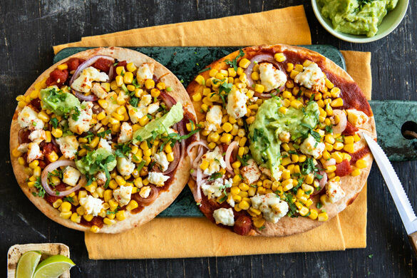 Das Schwierige am Pizza-selber-Machen ist ja immer der Teig. Das Problem entsteht hier aber gar nicht erst, denn bei diesen mexikanisch inspirierten, mit süßem Mais, Zwiebelringen und salzigem Feta belegten Pizzen besteht der Boden praktischerweise aus knusprigen Tortillas. Schneller geht’s nimmer! Am Ende noch einen guten Klecks Guacamole drauf, mit Koriander und frischer Limette garnieren und fertig sind die Fiesta-Häppchen!
