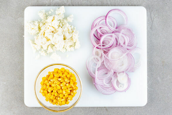 Den Backofen auf 200°C Umluft (220°C Ober-/Unterhitze) vorheizen. Den Feta mit den Fingern oder einer Gabel zerkrümeln. Die Zwiebel schälen und in feine Ringe schneiden. Die 1/2 des Maises in einem Sieb abtropfen lassen. Tipp: Wer mag, kann auch mehr Mais verwenden.