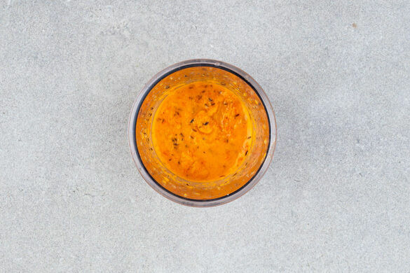 Die Tomaten vierteln und entkernen. Die Tomatenviertel in einem hohen Gefäß mit 1EL Olivenöl und 1 Prise Salz pürieren. Den gerösteten Kreuzkümmel unterrühren.