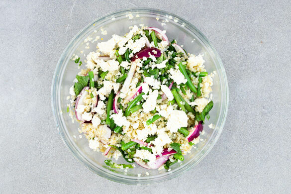 In einem mittelgroßen Topf 1L Wasser mit 1/2TL Salz zum Kochen bringen. Die Enden der Bohnen entfernen und die Bohnen quer halbieren. Den Bulgur in das kochende Wasser geben und ca. 10Min. kochen. Nach 3–5Min. die Bohnen zugeben und mitgaren. In einem feinmaschigen Sieb abtropfen und abkühlen lassen.