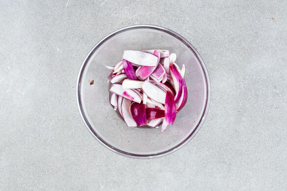 Die Zwiebel schälen und in Spalten schneiden. 2EL Essig mit 2EL Wasser, 1/2TL Zucker und 1 Prise Salz verrühren, bis sich der Zucker aufgelöst hat. Mit den Zwiebeln vermengen und beiseitestellen.