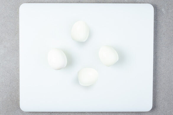 Den Backofen mit Grillfunktion oder Oberhitze-/Unterhitze auf 250°C vorheizen. Die Eier in einem kleinen Topf mit kaltem Wasser bedecken und abgedeckt zum Kochen bringen. Dann bei mittlerer Hitze in ca. 7Min. hart kochen.