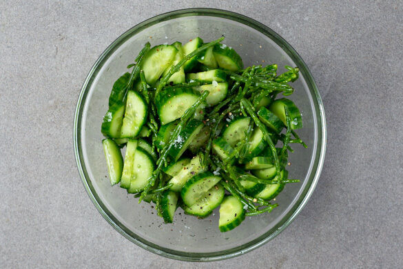 Inzwischen die Gurke längs halbieren und quer in dünne Scheiben schneiden. Mit dem Queller, je ½EL Olivenöl und Essig sowie je 1 Prise Salz und Pfeffer vermengen.