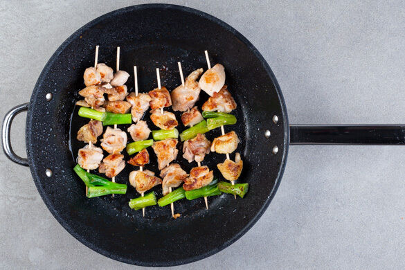 2 Fleischstücke gefolgt von 1 Lauchzwiebelstück auf einen Schaschlikspieß ziehen. So fortfahren, bis 12 Spieße gleichmäßig bestückt sind. Die Spieße in zwei großen Pfannen oder Grillpfannen mit je 1EL Pflanzenöl bei starker Hitze auf jeder Seite 3–4Min. braten, bis eine goldbraune Kruste entsteht.