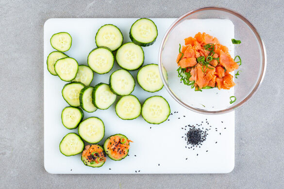 Was gibt es Schöneres, als alle Augen begehrlich auf sich gerichtet zu haben? Für unsere exquisiten Spießchen lautet die klare Antwort: Nichts! Das feine Hähnchenschenkelfleisch in süß-würziger Teriyakiglasur ist es gewohnt, im kulinarischen Mittelpunkt zu stehen. Nur ungern lässt es sich von der knackig-frischen Gurke mit Die __Gurken-Räucherlachs-Krönchen die Show stehlen. Darum: Ein Hoch auf unsere Low-Carb-Gaumenfreu(n)de!