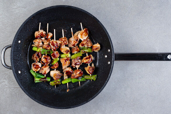 2 Fleischstücke gefolgt von 1 Lauchzwiebelstück auf einen Schaschlikspieß ziehen. So fortfahren, bis 6 Spieße gleichmäßig bestückt sind. Die Spieße in einer großen Pfanne oder Grillpfanne mit 1EL Pflanzenöl bei starker Hitze auf jeder Seite 3–4Min. braten, bis eine goldbraune Kruste entsteht.