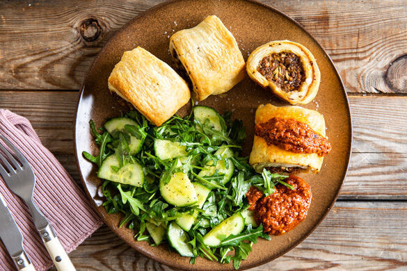 Können Röllchen Sünde sein? Vielleicht sind sie deren Ergebnis, aber wer von uns ohne Sünde ist, der bereite das erste Röllchen! Und das geht so: Du hüllst deftig gewürztes Schweinehack in geschmeidigen Blätterteig und backst das Ensemble zu köstlicher Vollkommenheit. Der besondere Stargast darin und darauf ist ein feines Pesto mit getrockneten Tomaten, dazu gibt’s erfrischenden Rucola-Gurken-Salat – alle Sünden vergeben!