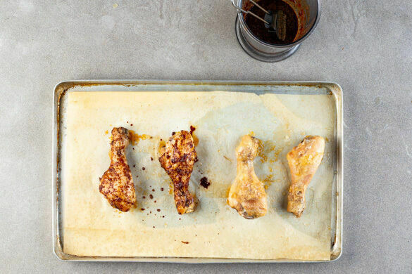 Die Drumsticks nach ca. 15Min. aus dem Ofen nehmen und mit der Würzsauce bestreichen. Noch ca. 10Min. im Ofen backen, bis das Fleisch gar ist.