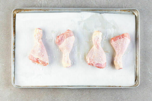 Die Drumsticks mit etwas Küchenkrepp trocken tupfen, dann rundum mit 4EL Pflanzenöl und 1 kräftigen Prise Salz einreiben. Auf einem mit Backpapier ausgelegten Backblech ca. 15Min. im Ofen vorbacken.