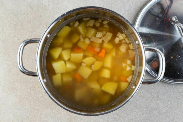 Die Karotten, den Knoblauch und die restlichen Zwiebeln in einem großen Topf mit 2EL Pflanzenöl und der restlichen Gewürzmischung bei mittlerer Hitze ca. 2Min. anbraten. Die Kartoffeln mit 350ml Wasser dazugeben und das Brühgewürz unterrühren. Das Gemüse abgedeckt ca. 10Min. garen.