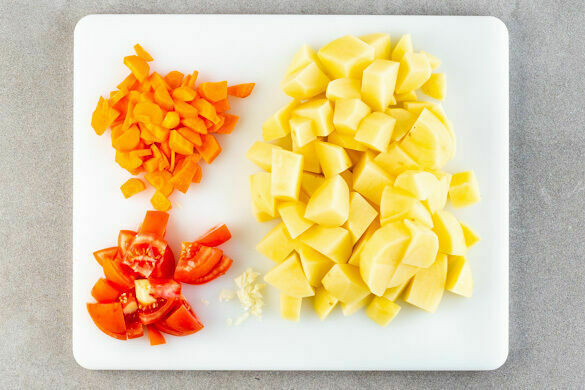 Den Backofen auf 240°C (220°C Umluft) vorheizen. Die Kartoffeln und grob würfeln. Die Karotten ggf. schälen, längs halbieren und in dünne Scheiben schneiden. Die Tomaten grob würfeln. Den Knoblauch schälen und ebenfalls grob würfeln.