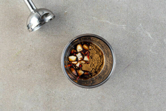 Inzwischen die Zwiebeln schälen und grob würfeln. Die Peperoni ggf. entkernen und fein würfeln. Die ½ der Zwiebeln und die ½ der Peperoni mit dem Ketjap Manis und der ½ der Gewürzmischung in einem hohen Gefäß pürieren.