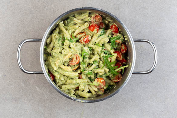Die Pasta in das kochende Wasser geben und in 7–9Min. bissfest kochen. Die Pasta in ein Sieb abgießen und abtropfen lassen, dabei mit einer Tasse etwas Pastawasser auffangen. Die Pasta zurück in den Topf geben und abgedeckt warm halten.