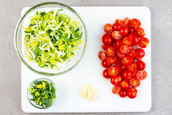 In einem mittelgroßen Topf ausreichend gesalzenes Wasser für die Pasta zum Kochen bringen. Den Lauch längs halbieren, dann in feine Streifen schneiden. Ca. 2EL Lauchgrün für die Garnitur beiseitelegen. Den Knoblauch schälen und fein würfeln. Die Kirschtomaten halbieren.