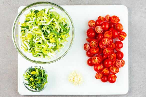 In einem großen Topf ausreichend gesalzenes Wasser für die Pasta zum Kochen bringen. Den Lauch längs halbieren, dann in feine Streifen schneiden. Ca. 3EL Lauchgrün für die Garnitur beiseitelegen. Den Knoblauch schälen und fein würfeln. Die Kirschtomaten halbieren.