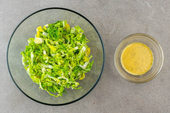 Den Salat längs in feine Streifen schneiden. Aus 1EL Olivenöl, 1EL Essig, ½EL Senf sowie je 1 Prise Salz, Pfeffer und Zucker ein Dressing anrühren und mit dem Salat vermengen. Das Fleisch in Tranchen schneiden. Die Pommes ggf. mit Salz würzen und mit dem Fleisch und dem Salat anrichten. Nach Belieben mit dem Schnittlauchjoghurt garnieren und servieren.