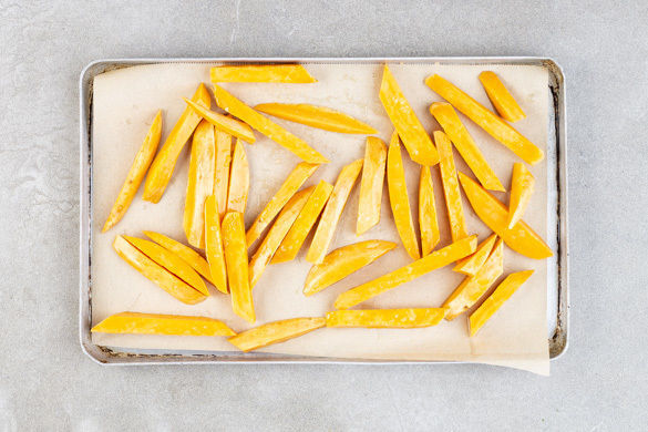 Die Süßkartoffeln schälen und in ca. 1cm dünne, pommesartige Stifte schneiden. Auf einem mit Backpapier ausgelegten Backblech mit 2EL Olivenöl und 1 kräftigen Prise Salz vermengen, gleichmäßig verteilen und in 12–15Min. im Ofen knusprig backen.
