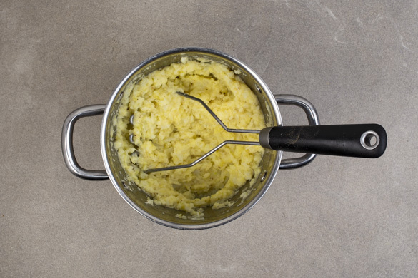 Die Kartoffeln in das kochende Wasser geben und in 15–20Min. gar kochen. Nach 10Min. der Kochzeit die Blumenkohlröschen zu den Kartoffeln geben und mitkochen, bis beide Gemüse gar sind. Mit einem Messbecher ca. 300ml Kochwasser abschöpfen, dann das Gemüse in ein Sieb abgießen.