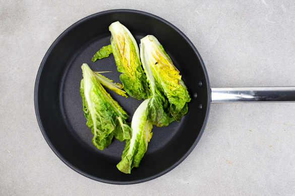 Den Salat in einer mittelgroßen Pfanne ohne Zugabe von Fett bei mittlerer Hitze mit der Schnittseite nach unten 1–2Min. anbraten. Aus der Pfanne nehmen und auf einem Teller beiseitestellen.