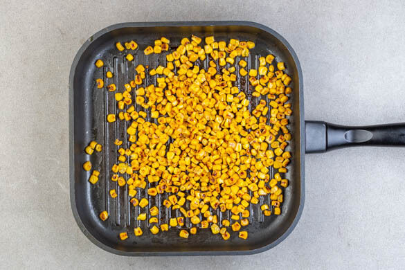 Drain the corn kernels in a sieve. Heat up a grill pan or medium normal pan on medium-high heat. Add ½Tbsp vegetable oil and fry the corn kernels for 6–9min. until they are nicely charred. Season with a large pinch of salt and then add the corn kernels to the pearl couscous salad. Wipe out the pan.
