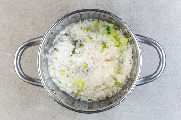 Die Lauchzwiebel grob schneiden. ½EL Butter in einem kleinen Topf schmelzen. Den Reis und die ½ der Lauchzwiebeln hinzugeben und 2–3Min. anbraten, bis der Reis glasig wird. 350ml heißes Wasser und 1 kräftige Prise Salz in den Topf geben, einmal zum Kochen bringen, dann abgedeckt bei niedrigster Hitze 10–12Min. kochen, bis das Wasser aufgesogen und der Reis gar ist.