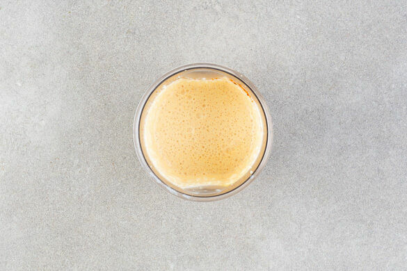 Den Backofen auf 220°C Umluft (240°C Ober-/Unterhitze) vorheizen. Die Zwiebel schälen, halbieren und grob würfeln. Den Knoblauch schälen und ebenfalls grob würfeln, dann in einem hohen Gefäß mit der Sojasahne, den Zwiebeln, dem Senf, den Hefeflocken, 1–2TL Paprikapulver und je 1/2TL Kurkuma und Salz zu einer glatten Sauce pürieren.