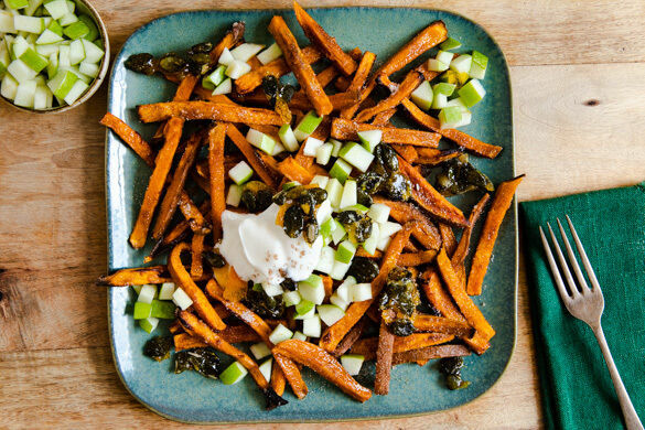 Die Süßkartoffel macht sich – wie der Name eigentlich schon andeutet – nicht nur in herzhaften Gerichten gut. So spielt sie hier in einer herbstlich-wärmenden Beilagenkomposition aus knackigen Apfelstückchen, karamellisierten Kürbiskernen und fein mit Vanille abgerundetem Joghurt die liebliche erste Geige. Für den geschmacklichen Trommelwirbel sorgt die klassische Mischung aus Zucker und Zimt.
