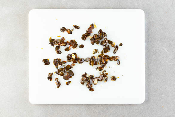 In einer kleinen Pfanne 2EL Zucker bei mittlerer bis niedriger Hitze schmelzen und leicht karamellisieren lassen. Die Kürbiskerne im geschmolzenen Zucker wenden und mit 1 Prise Salz würzen. Auf einem Stück Backpapier abkühlen lassen, dann grob hacken.