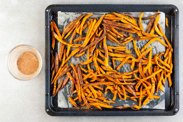 Die Süßkartoffelpommes gut mit der Zucker-Zimt-Mischung vermengen.