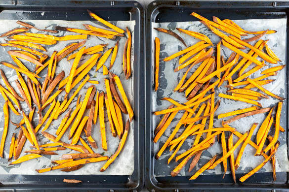 Den Backofen auf 220°C Umluft (240°C Ober-/Unterhitze) vorheizen. Die Süßkartoffeln längs halbieren und in ca. 0,5cm dicke, pommesartige Stifte schneiden. Auf einem oder ggf. zwei mit Backpapier ausgelegten Backblech(en) verteilen, mit 1–2EL Pflanzenöl und 1 Prise Salz vermengen und ca. 20Min. im Ofen backen. Dann wenden und weitere ca. 5Min. backen, bis die Pommes knusprig sind.