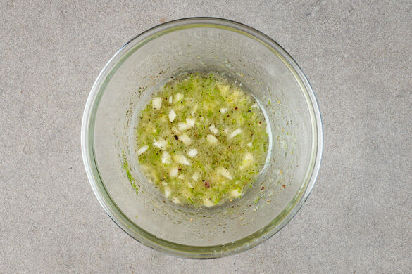 Die ½ des Ingwers mit 2EL Ananassaft, der Limettenschale, dem Knoblauch, 2EL Pflanzenöl, ½TL Zucker, ½TL Salz und 1 Prise Pfeffer zu einer Würzsauce verrühren.