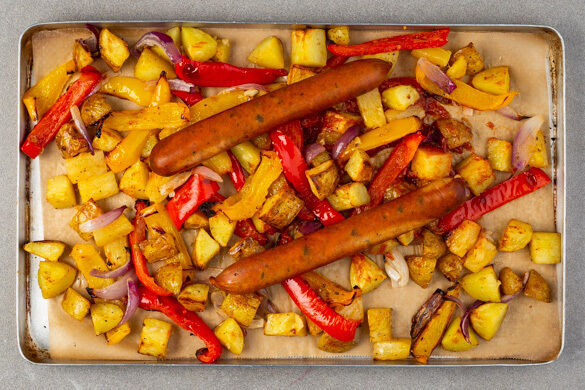 Fröhlich und bunt geht es heute Abend am Esstisch zu, wenn du die fruchtig gebackene Gemüsevariation und die deftigen Rauchwürste verkostest. Auf dem Blech tummeln sich Kartoffelwürfel, Paprika- und Zwiebelstreifen sowie saftige Ananasstückchen. Beflügelt von der Partybowle aus Ingwer und Limette tanzen sie Limbo mit den Würstchen und feiern ihre Einmaligkeit. Ein rauschendes Fest mit wenig Abwasch!